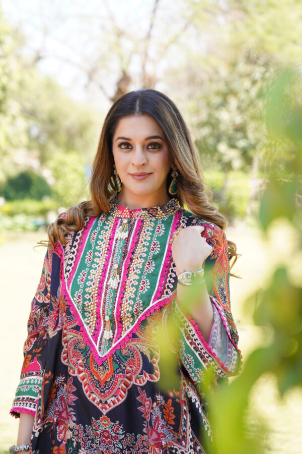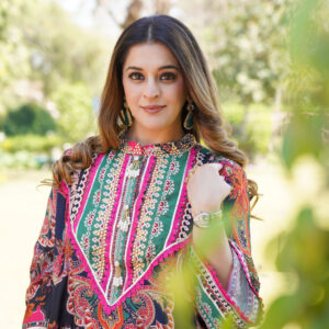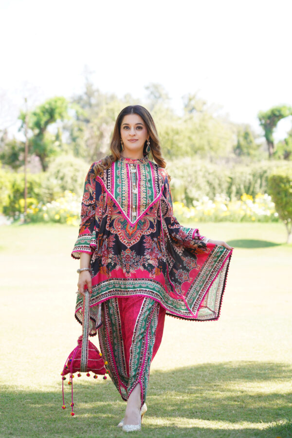 A stunning cape-style salwar suit featuring intricate floral and paisley prints in rich hues of red, green, and black. Designed with a high neckline and flowy silhouette, paired with fitted dhoti for a modern ethnic look. Perfect for festive occasions and celebrations.