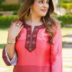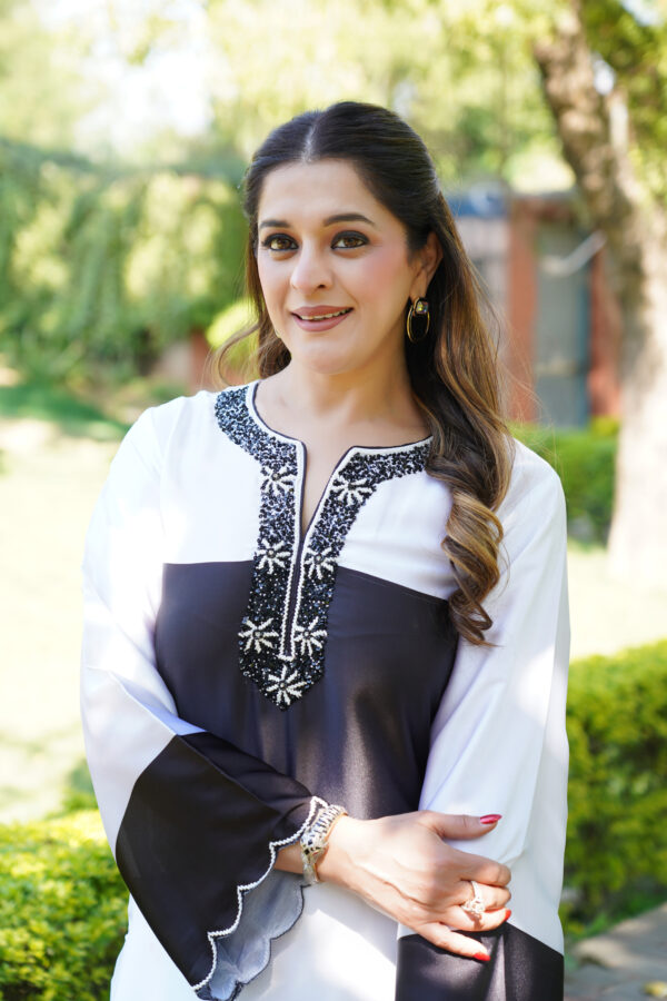 A classic black and white ensemble that exudes elegance and sophistication. The tunic features intricate hand-embroidered detailing on the neckline, paired with sleek trousers, making it a timeless piece for formal gatherings.