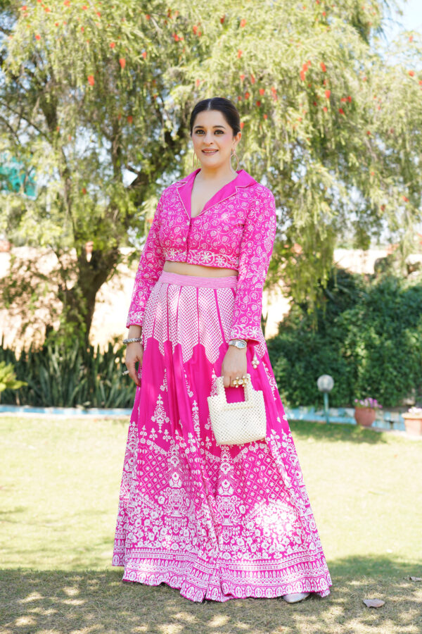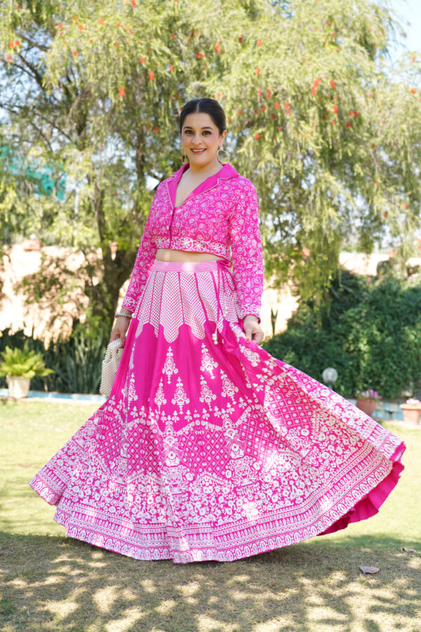 A bright pink lehenga set featuring intricate white embroidery. The cropped blouse has a stylish collar, and