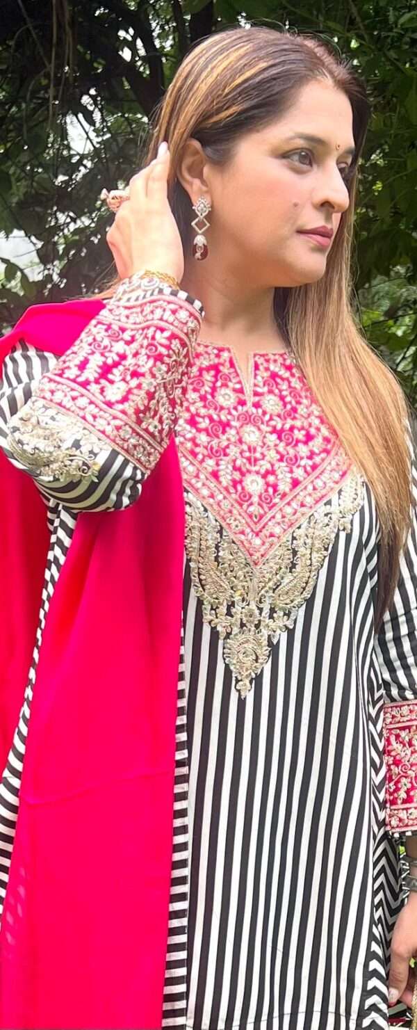 Elegance in every detail to make you sparkle this festive season Celebrate this season draped in our signature striped kurta with handwork salwar and Duppatta Fabric:- Pure crepe All sizes available Red colour also available